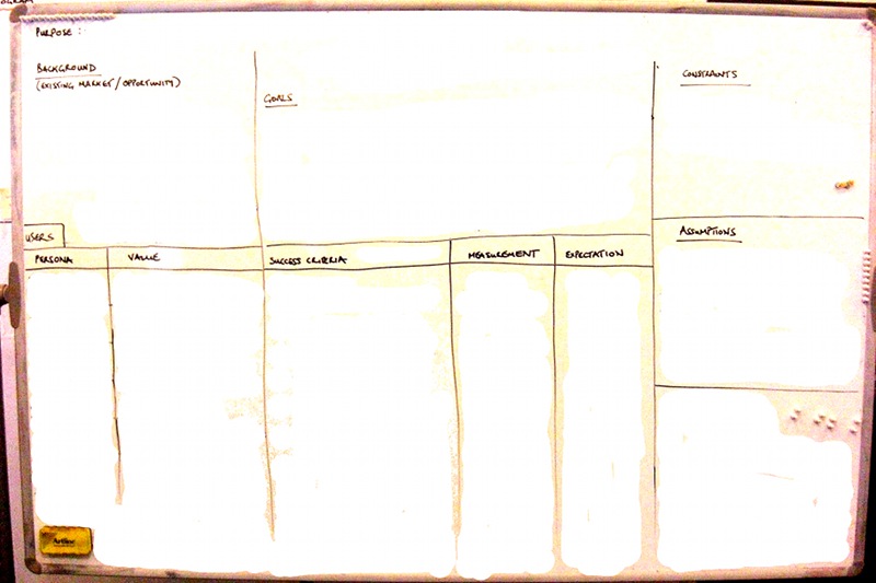 Picture of an A3 Charter whiteboard We have started with a blank whiteboard divided into the following sections: