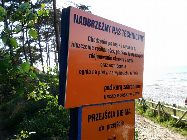 The coast however, like 2/3 of the Polish coastline, is constantly eroded and greedily taken by the see. Local authorities (in this case Maritime Office in Gdynia) put considerable effort in protecting the coast by building an infrastructure of plants, fences and boarders. They also try to ensure that people don’t destroy their work (all coastal dunes in Poland are under legal protection). Frequently you see sings like this one: